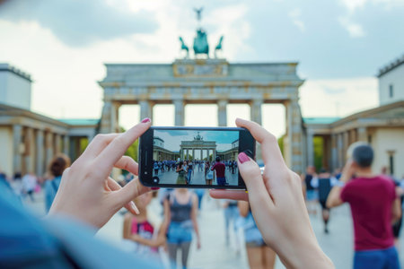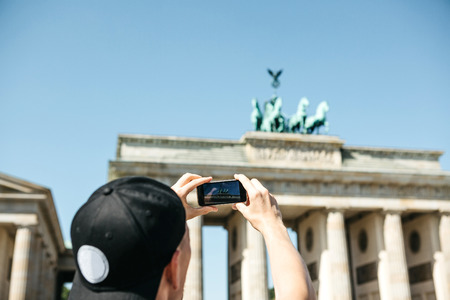 Tourist photographs on a mobile phone the Brandenburg Gate in Berlin in Germany. Sightseeing.