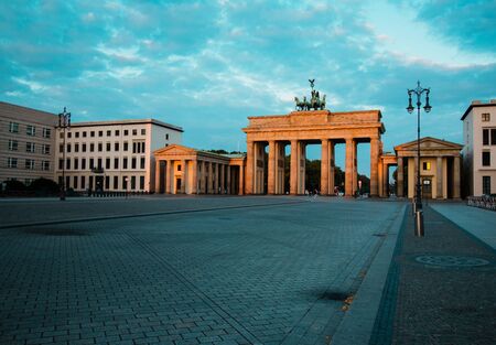 Berlin, Germany - 06.09.2018. Famous Brandenburger Tor (Brandenburg Gate) in beautiful golden morning light at sunrise.