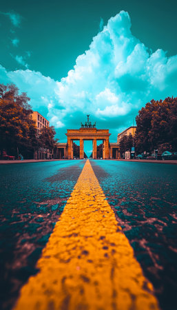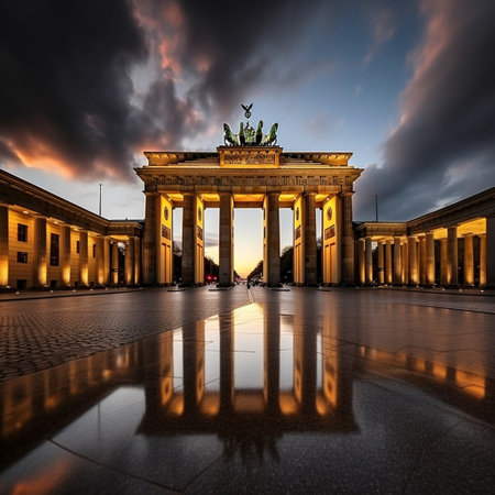 Capture the essence of Berlin in this dramatic shot, where the iconic Brandenburg Gate, a historic sandstone marvel, stands in magnificent contrast against the city's modern skyscrapers. AI-generated