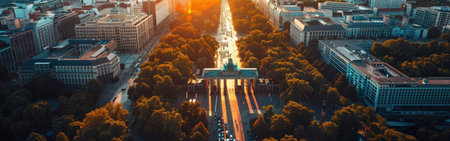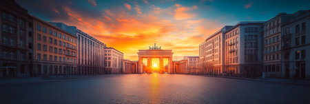 Immerse yourself in Berlin's vibrant culture and rich history with this panoramic view of the iconic Brandenburg Gate at sunset. The golden rays of the setting sun cast a warm glow over the city, highlighting its architectural beauty and historical significance. Surrounding the gate, you'll find elements that represent Berlin's diverse attractions, including the Reichstag Building, Checkpoint Charlie, the Holocaust Memorial, and the East Side Gallery. This image captures the unique character of Berlin, enticing viewers to explore its fascinating past and captivating present.