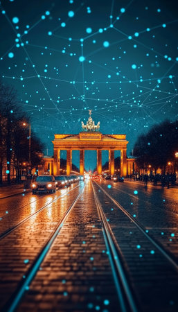 Brandenburg Gate Connected Illuminated Landmark in a Web of Digital Connections at Night, Berlin