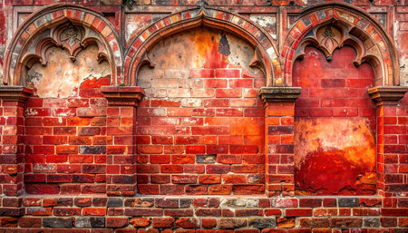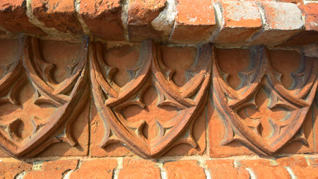 Close-Up of Gothic Brickwork with Ornamental Carvings. Detailed Gothic red brickwork features intricate ornamental carvings, highlighting historic architectural craftsmanship.