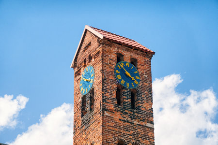 An old medieval brick clock tower against a blue sky. The town of Neman in the Kaliningrad region was formerly known as Ragnit.