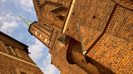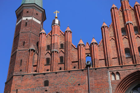 Brick building tower with spiers of Basilica Assumption Blessed Virgin Mary St Marys Church Cathedral on Piwna street with blue sky white clouds background, Gdansk, Poland