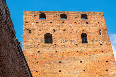 Ancient Castle Brick Walls in Historic Setting. Weathered brick walls of an old castle reveal historic charm, texture, and the enduring strength of medieval architecture.