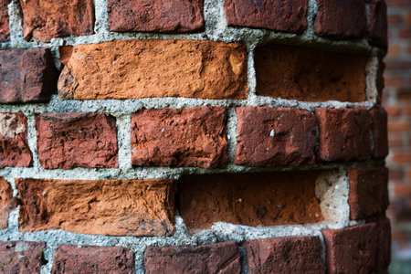 Side angle of a red brick wall corner. Close up view of cracked weathered brickwork material. Modern interior design, unique perspective. Loft like room style at home. Dark street or alleyway outside.