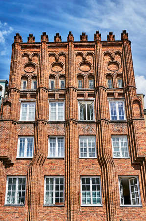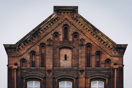 Brick facade of building with vintage decorative elements and arched windows in Krakow, Poland