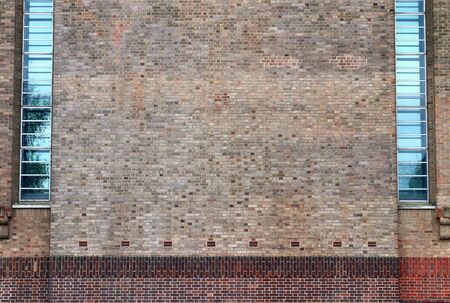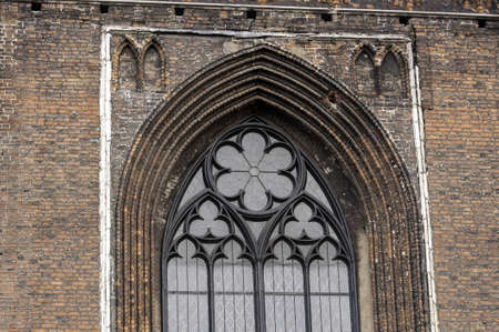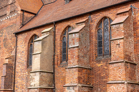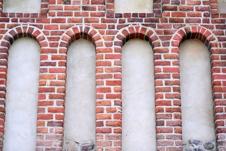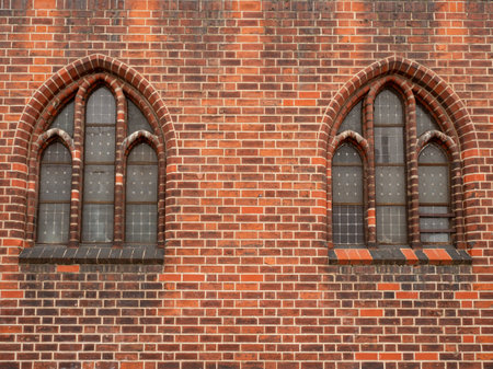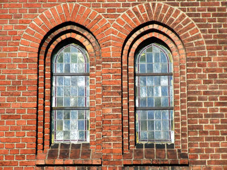 Medieval brick church windows. Gothic architecture. Historic masonry.