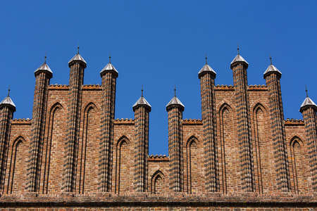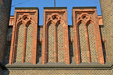 False gothic windows of the Friedrichsburg Gate against the blue sky. Kaliningrad