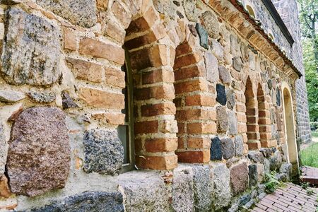 Details of a historic medieval church in Berlin, Germany. You can see a series of windows in a field stone wall.