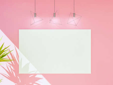 Empty canvas poster frame for mock up on pink wall with lamps, 3D Rendering