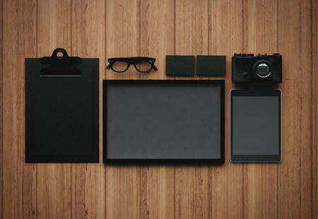 Top view of digital devices on worktable with mock up tablet, smartphone, camera and stationery
