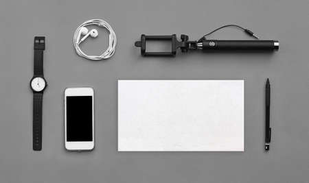 modern photography equipment over white table background. Everyday accessories.