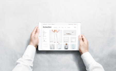 Hands holding tablet with fashion webstore mock up on screen, isolated.