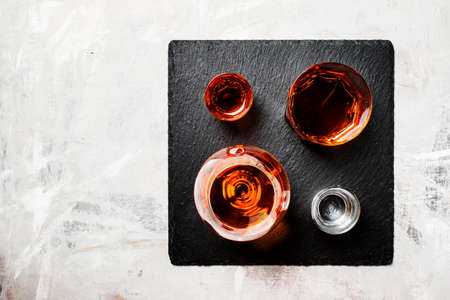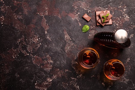 Two glasses of brandy or cognac and bottle with chocolate on dark background. top view with copy space