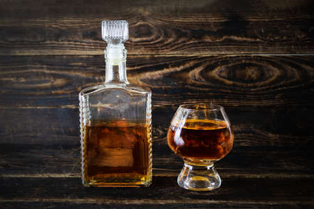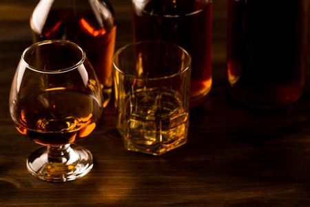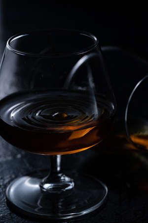 snifter of brandy in elegant typical cognac glass on dark background with space for text