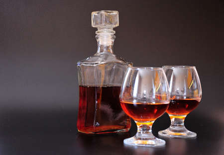 Glass bottle with a lid and two glasses with cognac on a black background. Close-up.