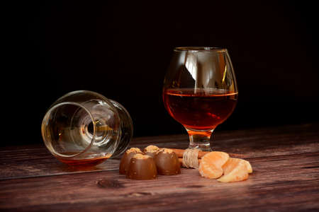 Two glasses of cognac, cinnamon, chocolates and tangerine slices on a wooden table. close-up.