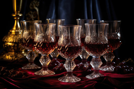 wine glasses on a mirrored surface reflecting their shapes, created with generative ai