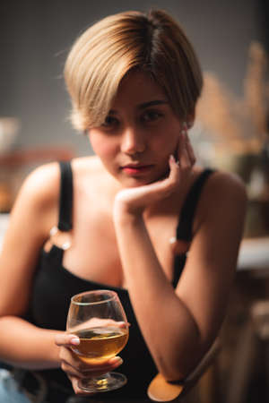 Attractive bartender girl holding in her hands fresh cocktail at the bar counter for celebration