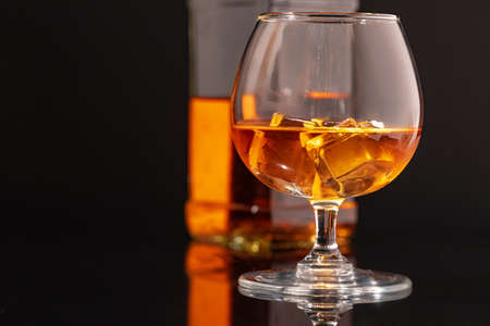 Cognac glass with ice cubes on the table with a luxury leather black background - close-up product photo