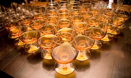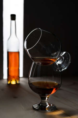 Party and holiday celebration concept. Empty glasses for cognac on the bar counter. cognac bottling process. with the hand view
