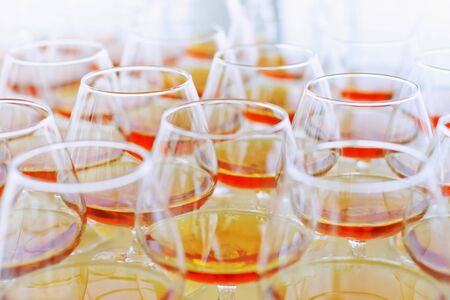 Konjac rows on table at wedding reception. Cocktails and whiskey in glasses at alcohol bar at wedding or christmas feast. Luxury catering