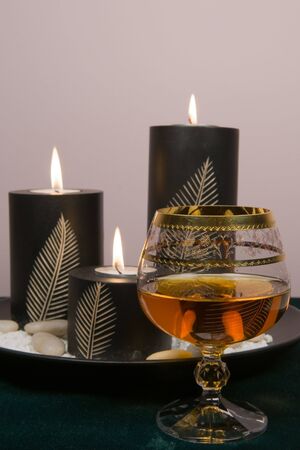 A glass of brandy and cigar smoke in the dark on the background of the fireplace. Gentlemens club concept