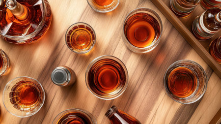 This image captures an assortment of whiskey glasses and bottles arranged on a wooden surface, showcasing the rich amber tones of fine spirits for a refined tasting experience.