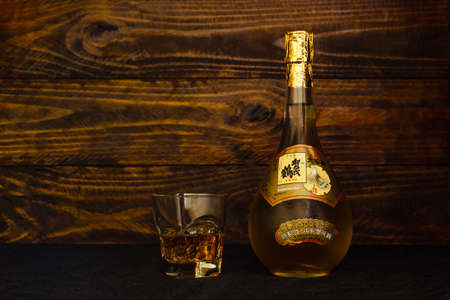 A bottle of Japanese Sake Kamotsuru Gold and a glass with ice on a dark wooden background. Kamotsuru Sake is made from a special type of rice called Shuzokotekimai. Russia Krasnodar, December 11, 2021