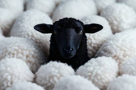 A black sheep stands out among crowd of white sheep, creating striking contrast. scene captures uniqueness and individuality in herd