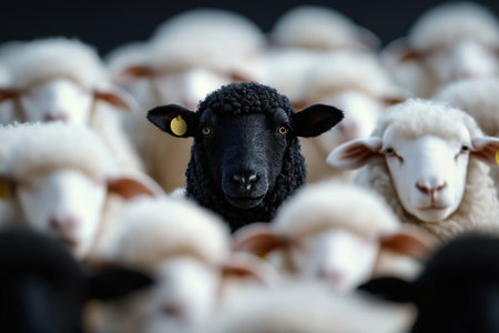 Closeup of one black sheep among a flock of white sheep symbolizing uniqueness and standing out from the crowd. Concept Black Sheep Symbolism, Uniqueness, Standing Out, Flock of Sheep