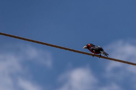 Double-toothed Barbets (Lybius bidentatus) perched on overhead wires, Entebbe, Uganda