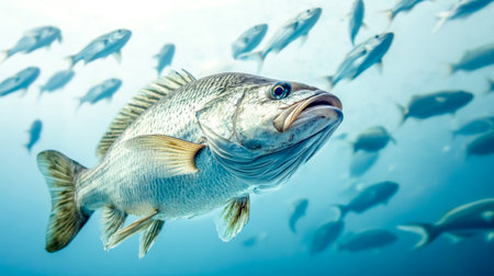 A large fish with its mouth open is swimming in the dark blue water. The fish appears to be in a state of hunger, as it is looking for food. Concept of mystery and intrigue