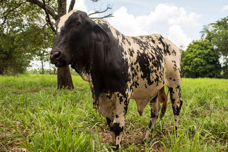 Black and white bull standing on green and bright pasture in the countryside