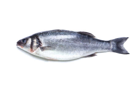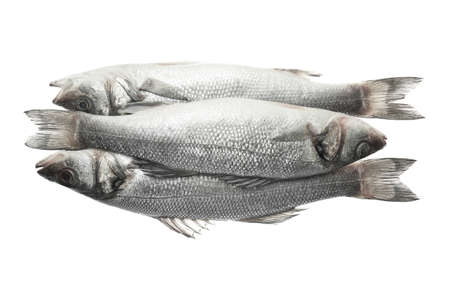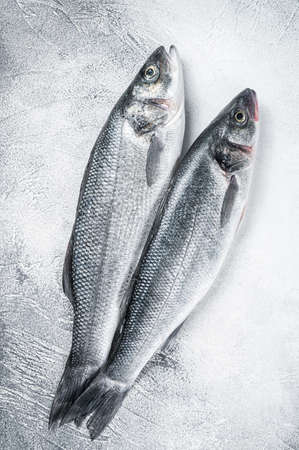 Fresh raw seabass fish on kitchen table. White background. Top view