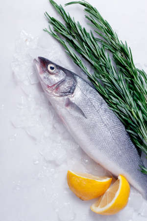 Raw sea bass on ice with rosemary, thyme and lemon. Gray background, top view