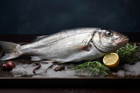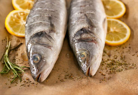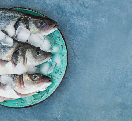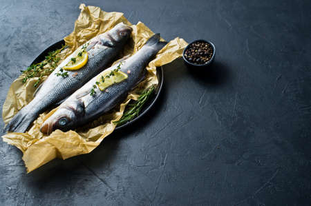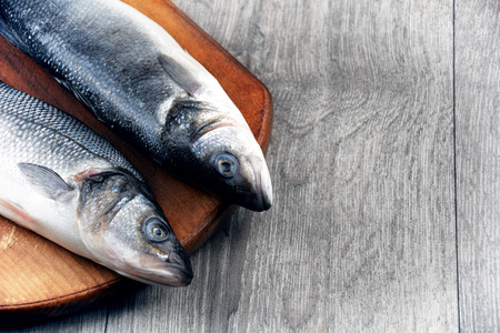 Raw sea bass ready for cooking. Healthy eating ingredient, space for text