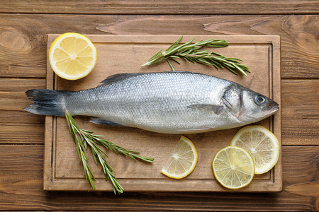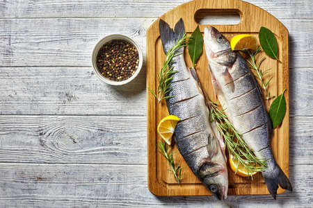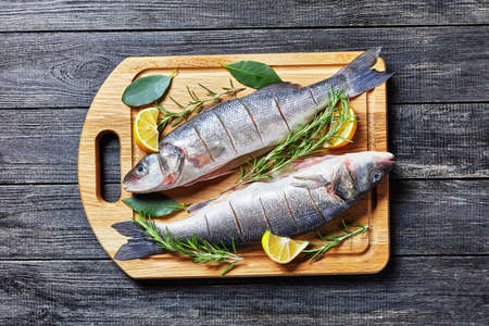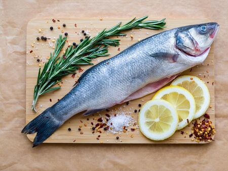 Sea Bass fresh fish gutted and descaled on a cutting board with fresh rosemary, lemon wedges and bay leaf on a cutting board on a wooden background, top view, close-up