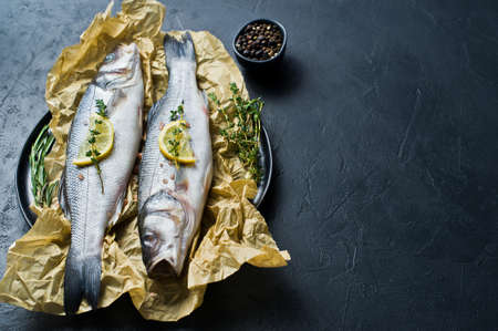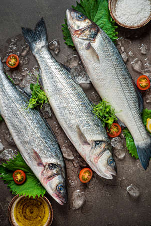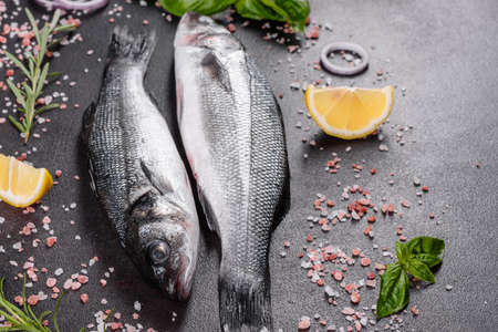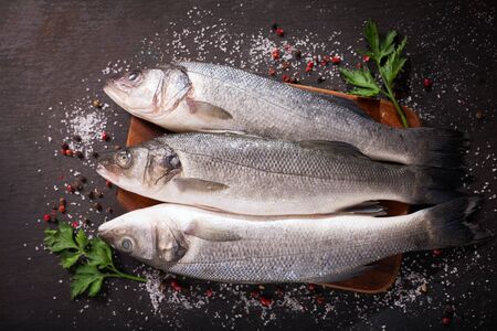 Fresh fish seabass and ingredients for cooking. Raw fish seabass with spices and herbs on a dark table