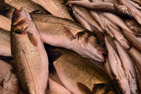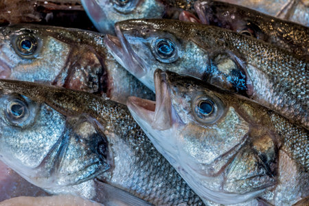 Dicentrarchus labraxis is a white fish of the Moronidae family. A lot of fresh fish on ice on a store counter, freshly caught fish heads, vertical background