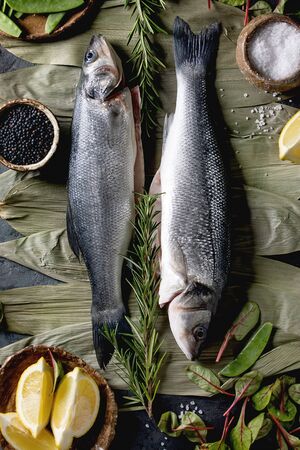 Raw fresh uncooked fish sea bass on dry bamboo leaves ready to cook with lemon, sea salt, black and green beans, green salad over dark texture concrete background. Flat lay, space