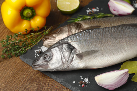 Two Seabass raw fish with shellfish and spices on wooden table w