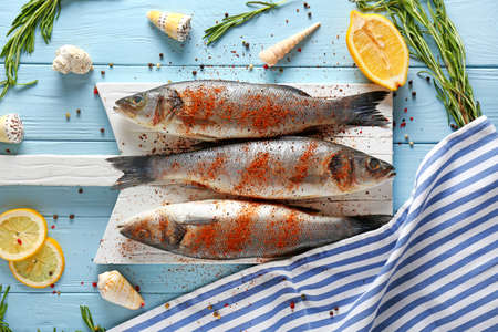 Fresh raw seabass with spices on gray table, top view. Fish and seafood delicacies
