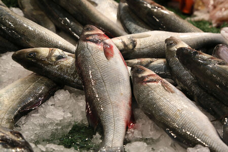 Fresh sea bass, Dicentrarchus labrax, on display on a UK fishmongers market stall