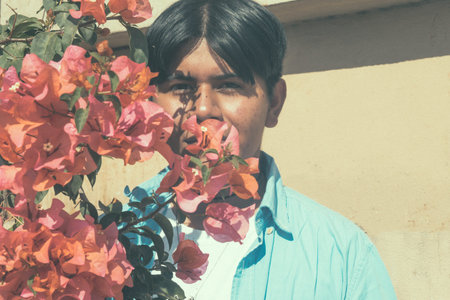 Bangladesh, Rangpur- July 03, 2021. A boy has two hands behind his head and the background behind him blurred