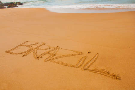 BRAZIL: Inscription on the sand, drawing with the name of the country Brazil.. South America
