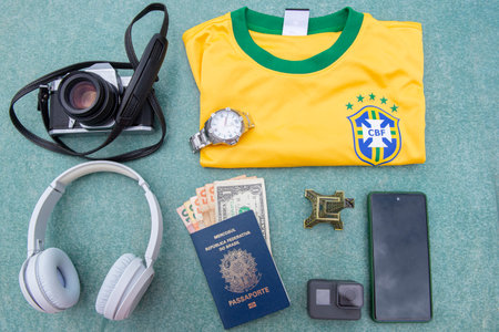 11 Jan 2023: Bauru, Brazil: Antique camera, silver wristwatch, Brazilian soccer team t-shirt, headphones, passport with banknotes, cell phone and miniature of the Eiffel Tower on a chalk board