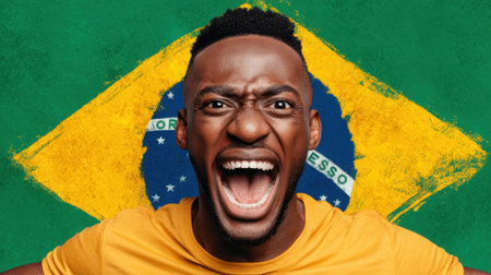 Close up of a man with Brazilian flag painted on his face, shouting with excitement.