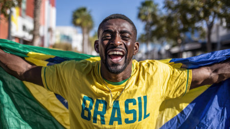 A joyful Black man with his arms outstretched, wrapped in the Brazilian flag, celebrating with an open mouth and closed eyes.